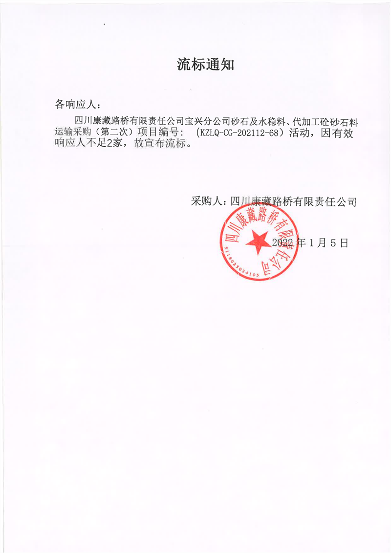 四川康藏路橋有限責任公司寶興分公司砂石及水穩(wěn)料、代加工砼砂石料運輸采購(第二次)流標通知