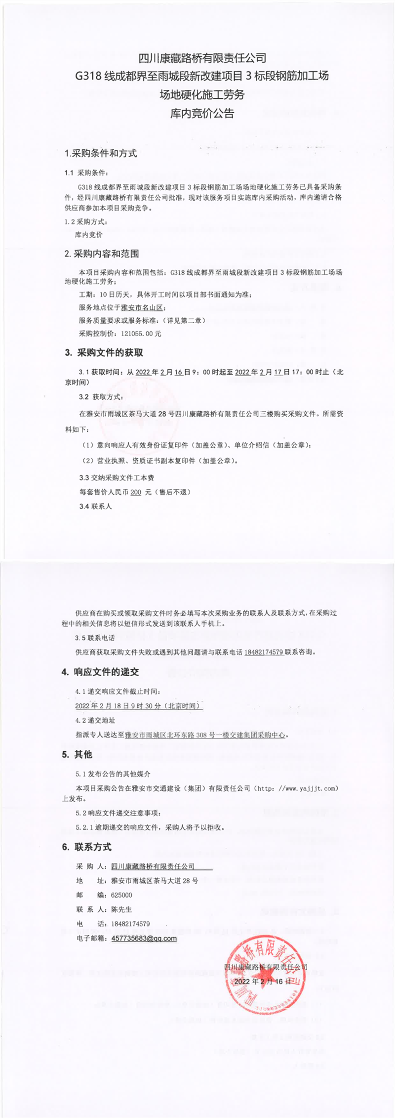 四川康藏路橋有限責(zé)任公司G318線成都界至雨城段新改建項(xiàng)目3標(biāo)段鋼筋加工場(chǎng)場(chǎng)地硬化施工勞務(wù)庫(kù)內(nèi)競(jìng)價(jià)公告