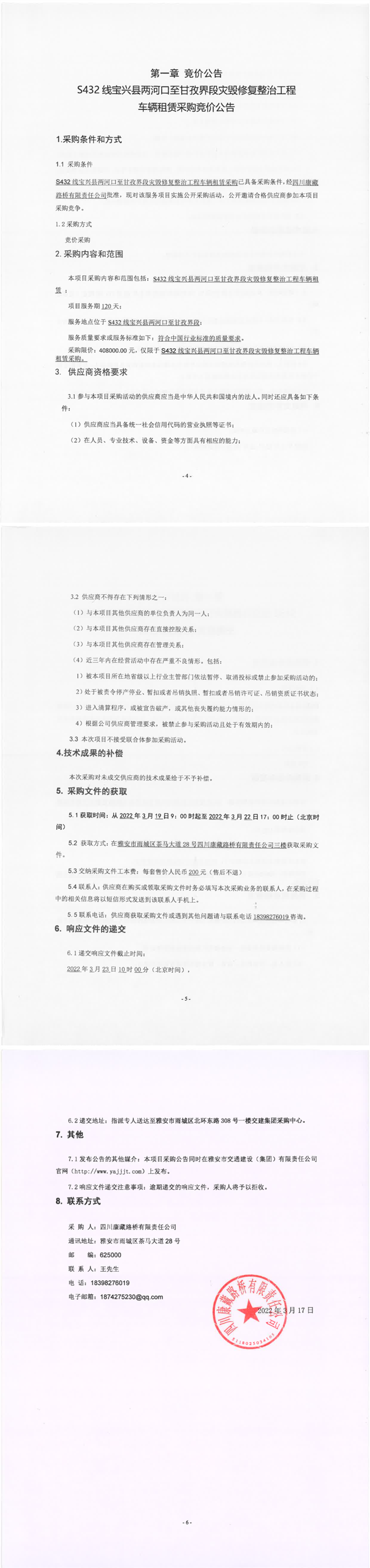 四川康藏路橋有限責(zé)任公司S432線寶興縣兩河口至甘孜界段災(zāi)毀修復(fù)整治工程車輛租賃采購競價(jià)公告