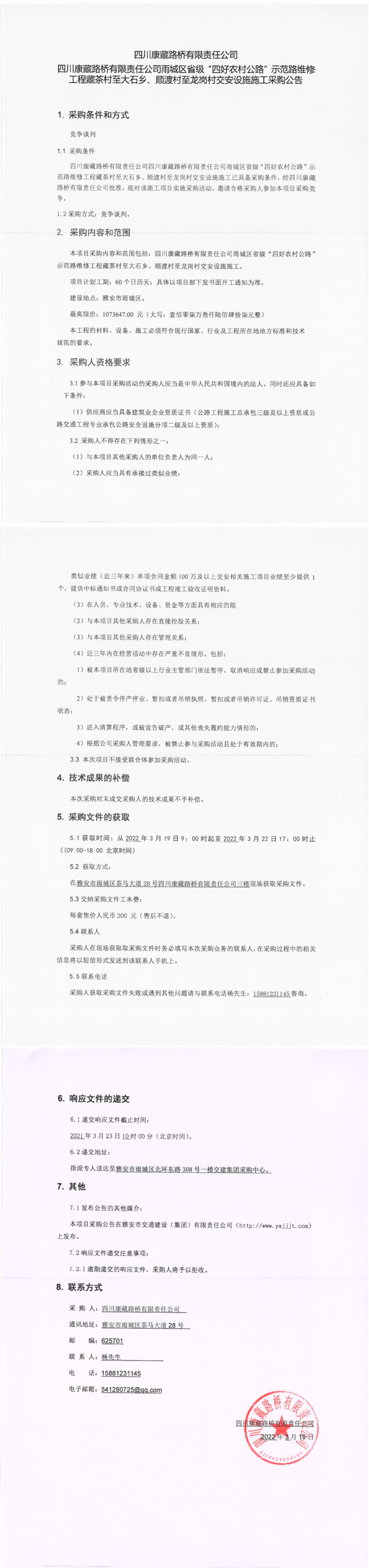 四川康藏路橋有限責任公司雨城區(qū)省級“四好農村公路”示范路維修工程藏茶村至大石鄉(xiāng)、順渡村至龍崗村交安設施施工采購公告
