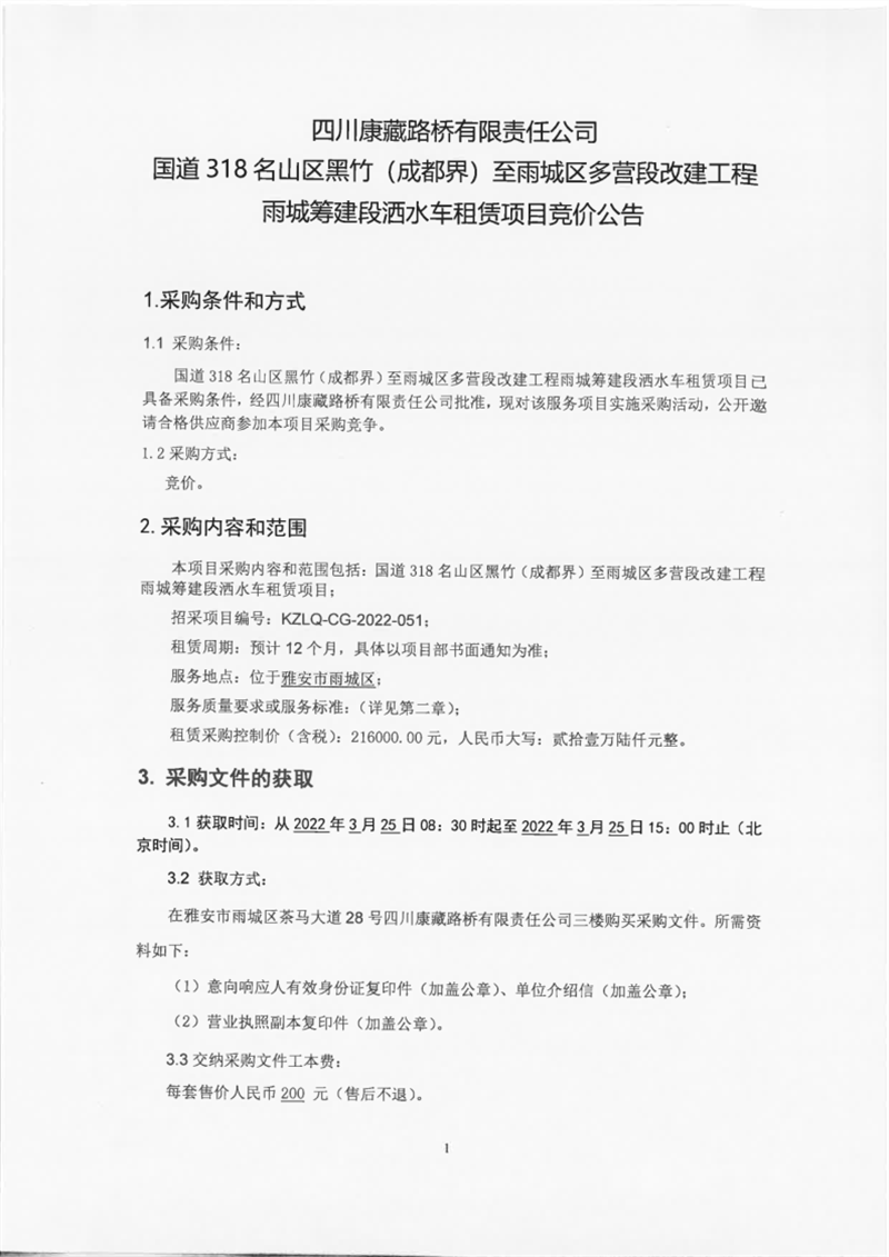 四川康藏路橋有限責(zé)任公司國(guó)道318名山區(qū)黑竹(成都界)至雨城區(qū)多營(yíng)段改建工程雨城籌建段灑水車租賃項(xiàng)目競(jìng)價(jià)公告