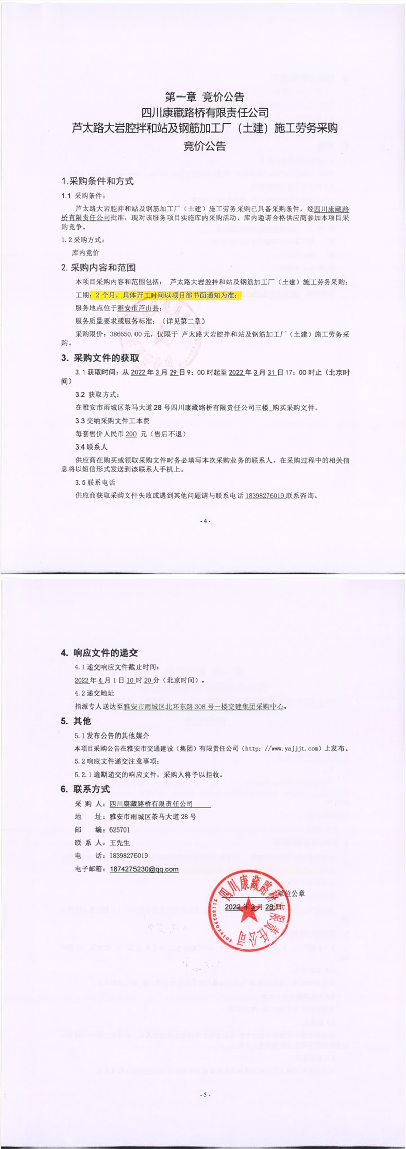 四川康藏路橋有限責任公司蘆太路大巖腔拌和站及鋼筋加工廠(土建)施工勞務采購競價公告