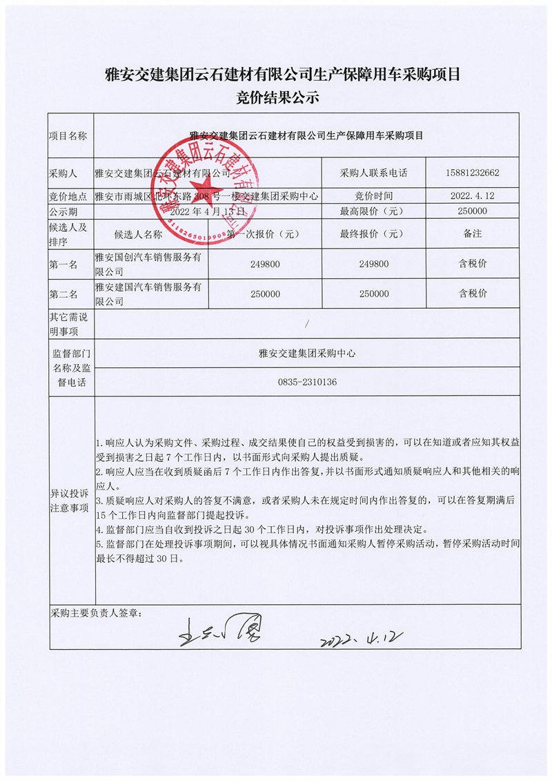 雅安交建集團云石建材有限公司生產(chǎn)保障用車采購項目競價結(jié)果公示