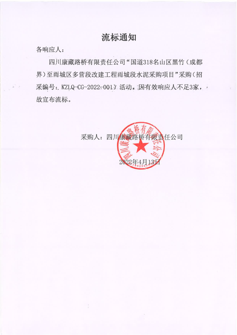 四川康藏路橋有限責(zé)任公司國(guó)道318名山區(qū)黑竹(成都界)至雨城區(qū)多營(yíng)段改建工程雨城段水泥采購(gòu)項(xiàng)目流標(biāo)通知