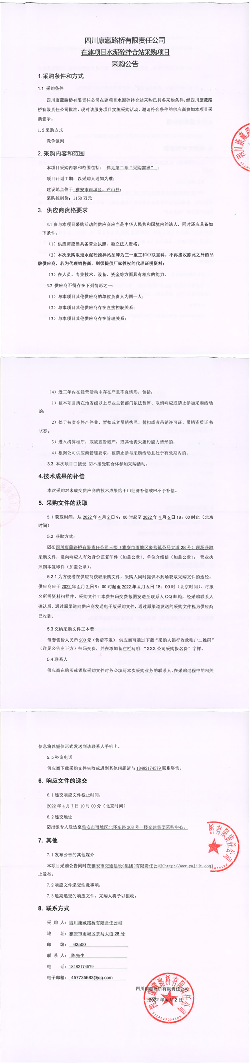 四川康藏路橋有限責(zé)任公司在建項目水泥砼拌合站采購項目采購公告
