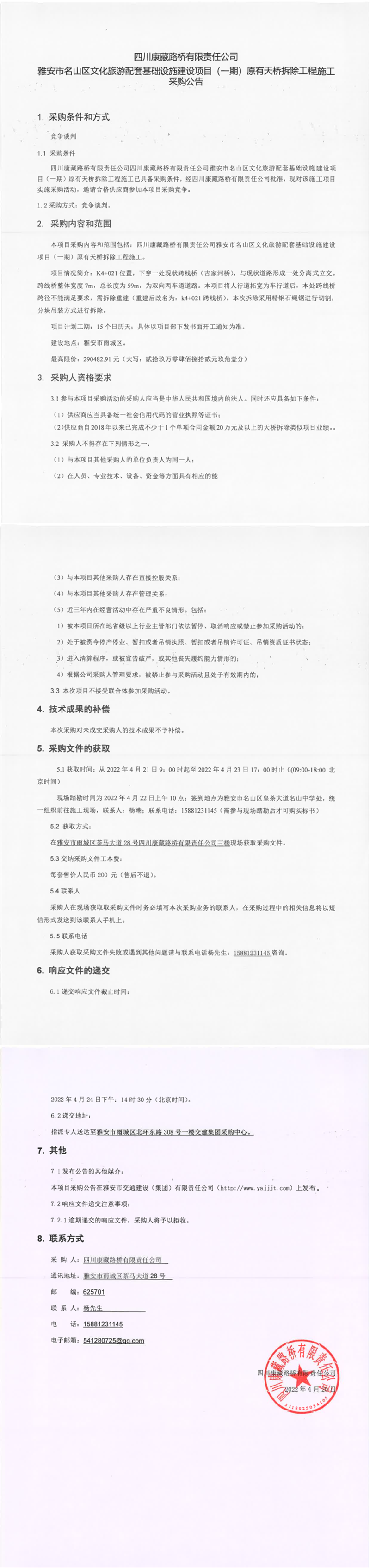 四川康藏路橋有限責(zé)任公司雅安市名山區(qū)文化旅游配套基礎(chǔ)設(shè)施建設(shè)項目(一期)原有天橋拆除工程施工采購公告