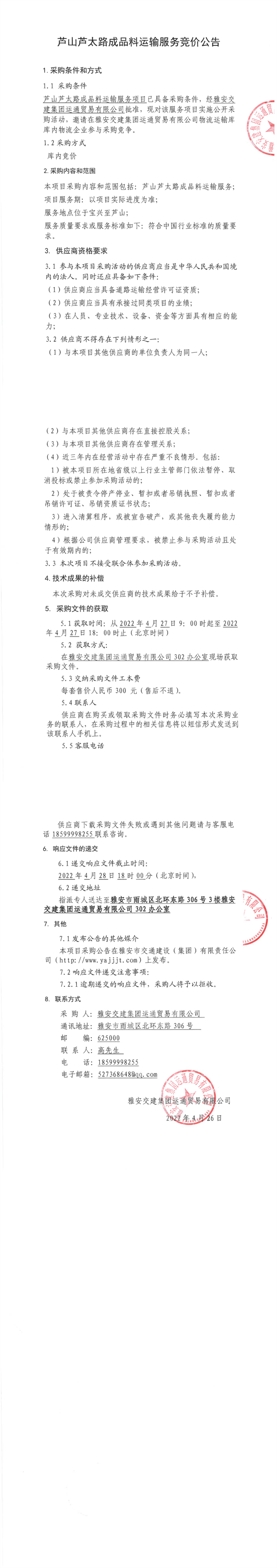 雅安交建集團(tuán)運(yùn)通貿(mào)易有限公司蘆山蘆太路成品料運(yùn)輸服務(wù)競(jìng)價(jià)公告