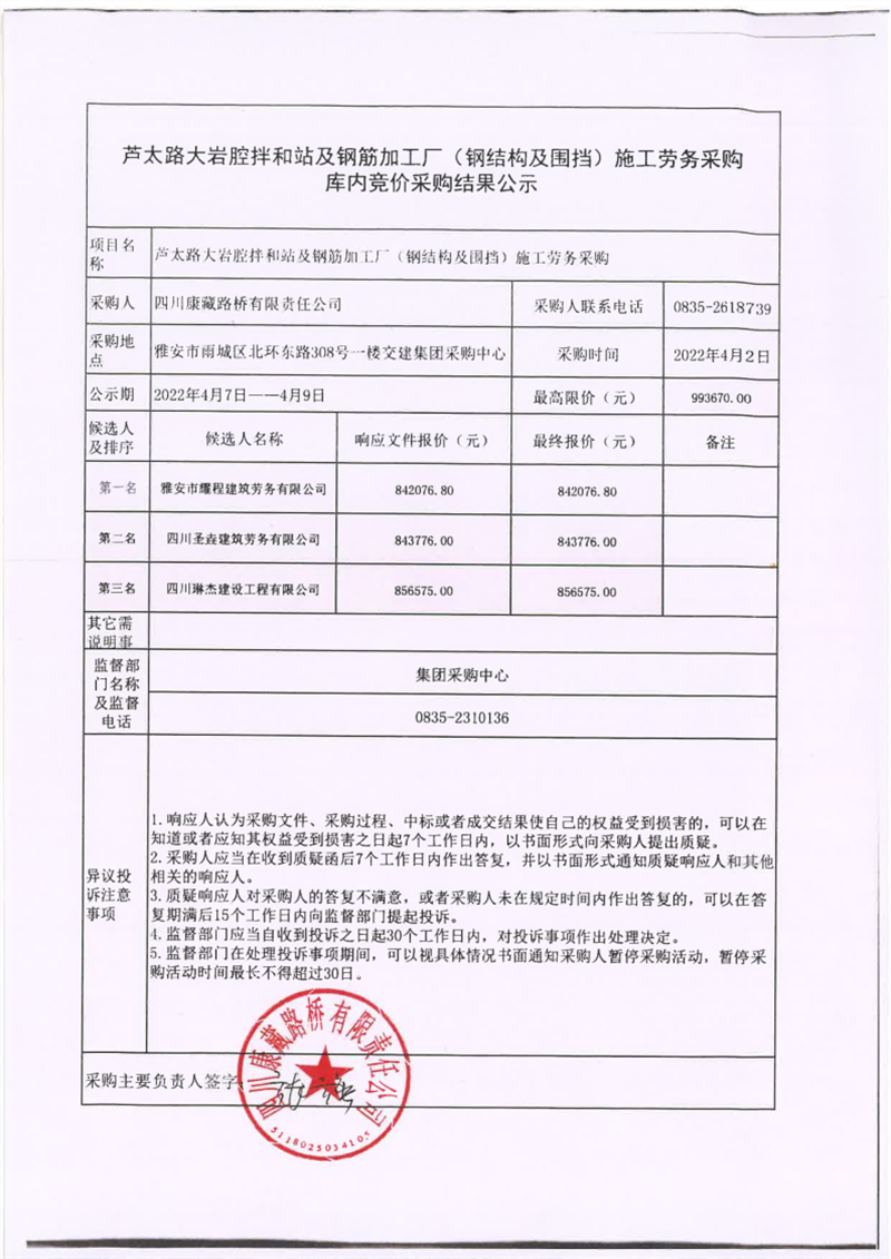 四川康藏路橋有限責(zé)任公司蘆太路大巖腔拌和站及鋼筋加工廠(鋼結(jié)構(gòu)及圍檔)施工勞務(wù)采購(gòu)庫(kù)內(nèi)競(jìng)價(jià)采購(gòu)結(jié)果公示