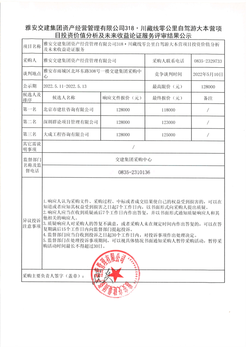 雅安交建集團資產(chǎn)經(jīng)營管理有限公司318·川藏線零公里自駕游大本營項目投資價值分析及未來收益論證服務(wù)評審結(jié)果公示