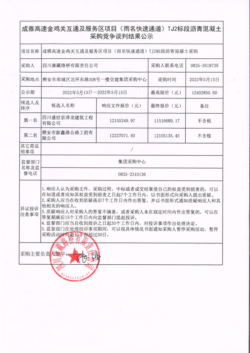 四川康藏路橋有限責(zé)任公司成雅高速金雞關(guān)互通及服務(wù)區(qū)項(xiàng)目(雨名快速通道)TJ2標(biāo)段瀝青混凝土采購競爭談判結(jié)果公示