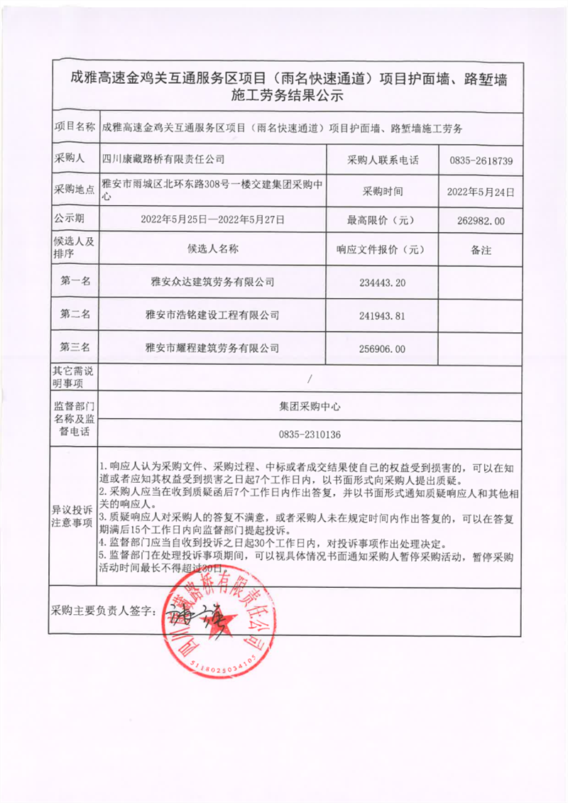 四川康藏路橋有限責(zé)任公司成雅高速金雞關(guān)互通及服務(wù)區(qū)項(xiàng)目(雨名快速通道)項(xiàng)目護(hù)面墻、路塹墻施工勞務(wù)結(jié)果公示