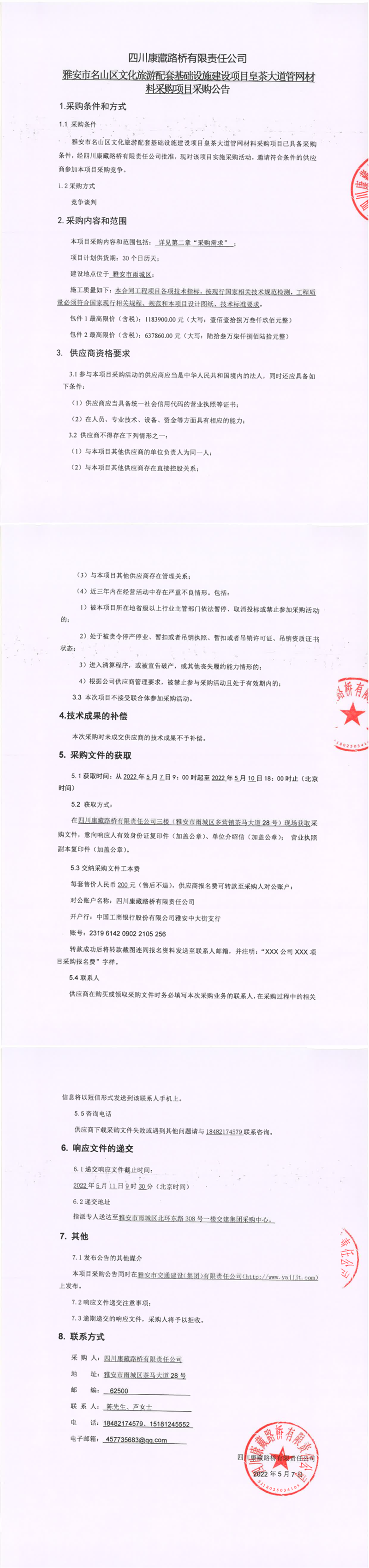 四川康藏路橋有限責任公司雅安市名山區(qū)文化旅游配套基礎(chǔ)設(shè)施建設(shè)項目皇茶大道管網(wǎng)材料采購項目采購公告