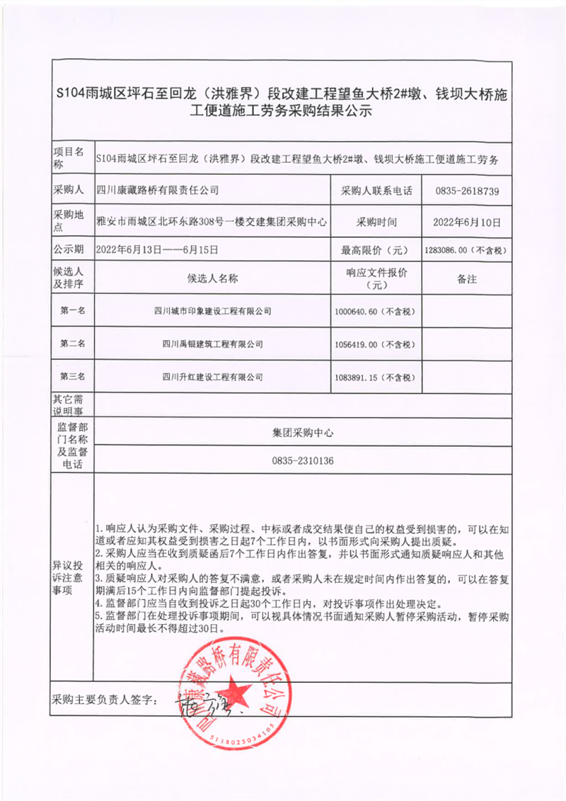四川康藏路橋有限責(zé)任公司S104雨城區(qū)坪石至回龍(洪雅界)段改建工程望魚(yú)大橋2#墩、錢(qián)壩大橋施工便道施工勞務(wù)采購(gòu)結(jié)果公示
