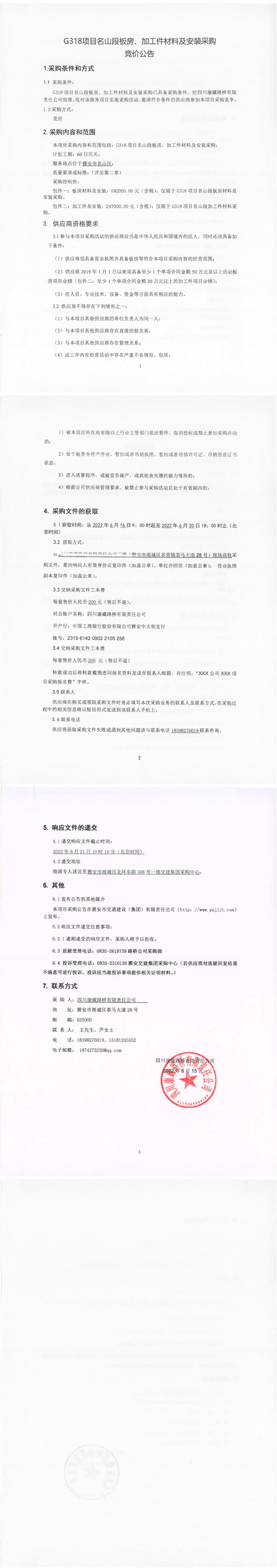 四川康藏路橋有限責(zé)任公司G318項(xiàng)目名山段板房、加工件材料及安裝采購(gòu)競(jìng)價(jià)公告