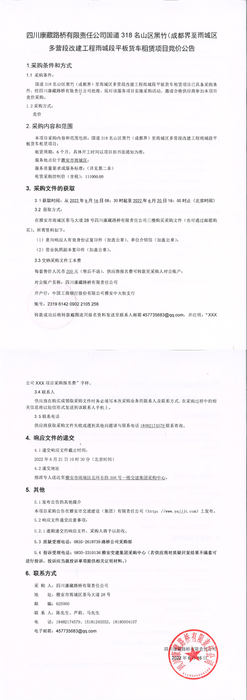 四川康藏路橋有限責(zé)任公司國道318名山區(qū)黑竹(成都界)至雨城區(qū)多營段改建工程雨城段平板貨車租賃項目競價公告