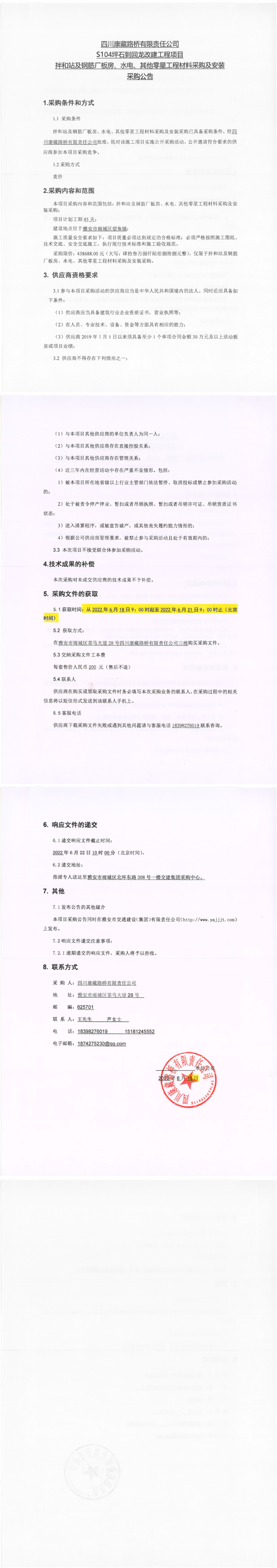 四川康藏路橋有限責(zé)任公司S104坪石到回龍改建工程項目拌和站及鋼筋廠板房、水電、其他零星工程材料采購及安裝采購公告