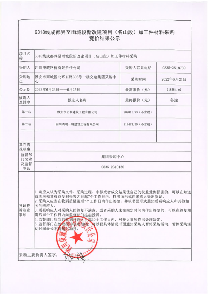 四川康藏路橋有限責(zé)任公司G318線成都界至雨城段新改建項(xiàng)目(名山段)加工件材料采購競(jìng)價(jià)結(jié)果公示