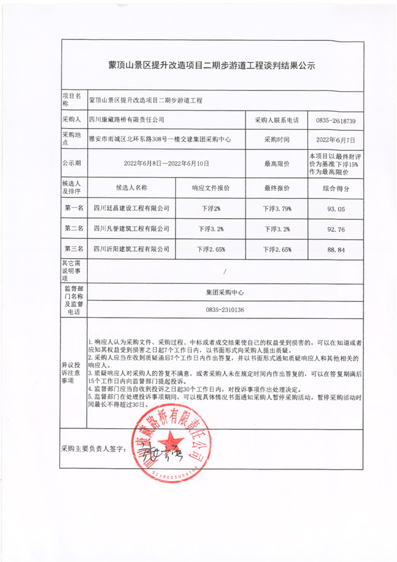 四川康藏路橋有限責(zé)任公司蒙頂山景區(qū)提升改造項(xiàng)目二期步游道工程談判結(jié)果公示