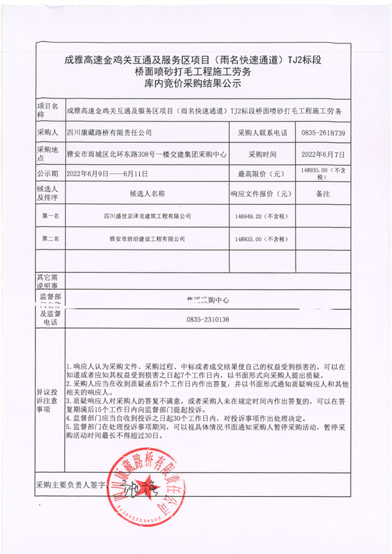四川康藏路橋有限責(zé)任公司成雅高速金雞關(guān)互通服務(wù)區(qū)項(xiàng)目(雨名快速通道)TJ2標(biāo)段橋面噴砂打毛工程施工勞務(wù)庫(kù)內(nèi)競(jìng)價(jià)采購(gòu)結(jié)果公示