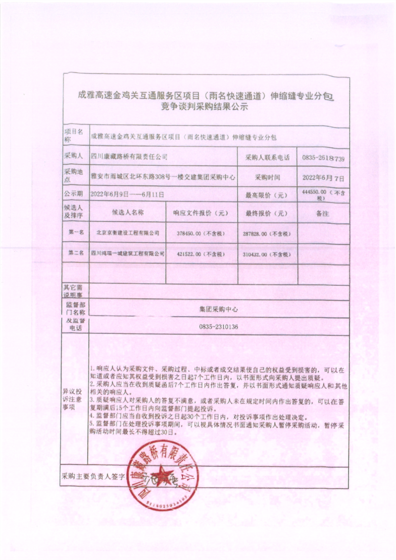 四川康藏路橋有限責任公司成雅高速金雞關互通服務區(qū)項目(雨名快速通道)伸縮縫工程專業(yè)分包競爭談判采購結果公示
