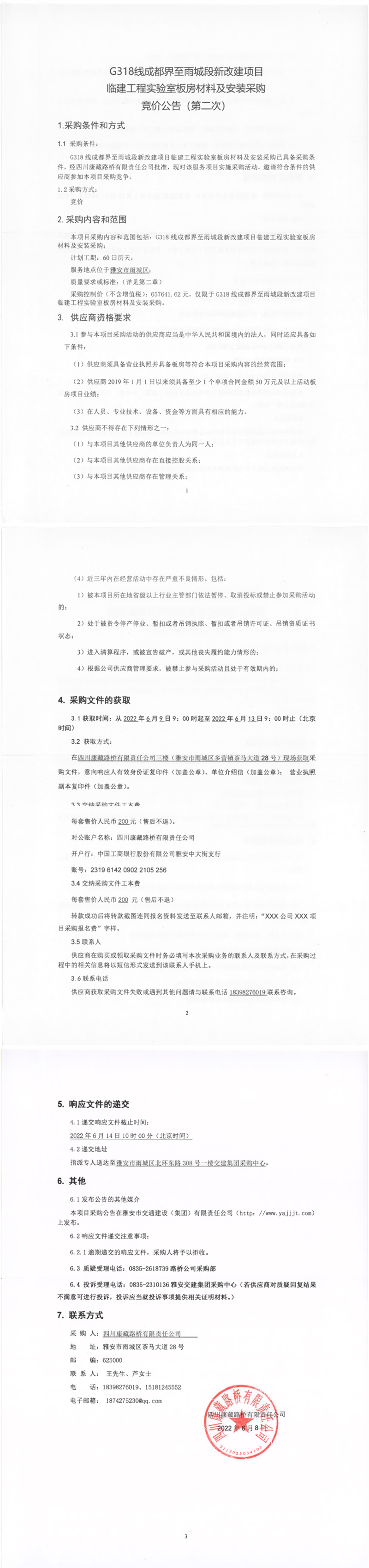 四川康藏路橋有限責任公司G318線成都界至雨城段新改建項目臨建工程實驗室板房材料及安裝采購競價公告(第二次)