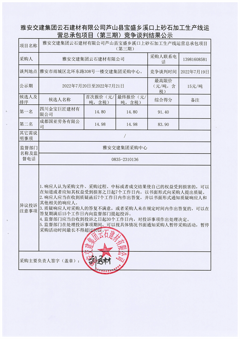 雅安交建集團(tuán)云石建材有限公司蘆山縣寶盛鄉(xiāng)溪口上砂石加工生產(chǎn)線運(yùn)營總承包項(xiàng)目(第三期)競(jìng)爭(zhēng)談判結(jié)果公示