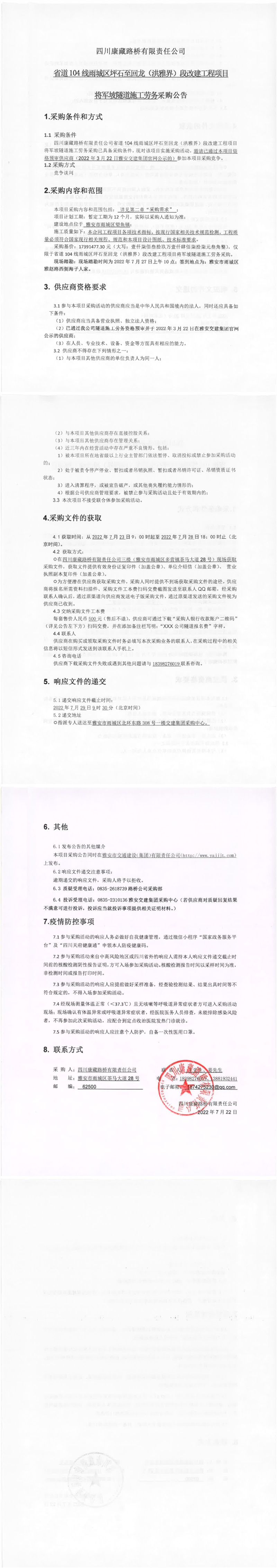 四川康藏路橋有限責(zé)任公司省道104線雨城區(qū)坪石至回龍(洪雅界)段改建工程項(xiàng)目將軍坡隧道施工勞務(wù)采購公告