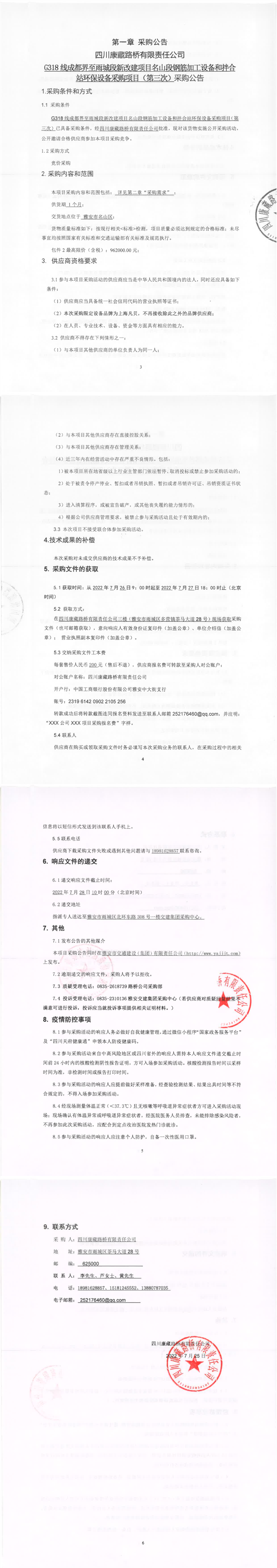 四川康藏路橋有限責任公司G318線成都界至雨城段新改建項目名山段鋼筋加工設備和拌合站環(huán)保設備采購項目(第三次)采購公告
