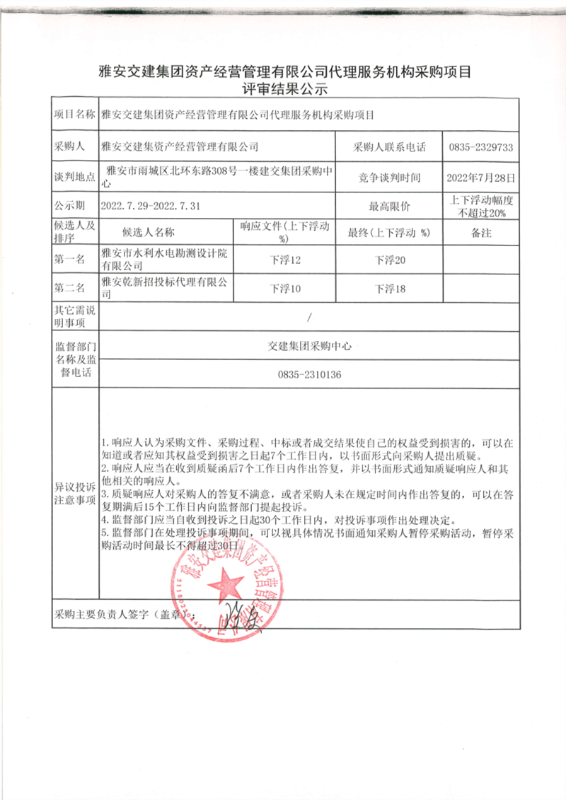 雅安交建集團(tuán)資產(chǎn)經(jīng)營管理有限公司代理服務(wù)機(jī)構(gòu)采購項(xiàng)目評(píng)審結(jié)果公示
