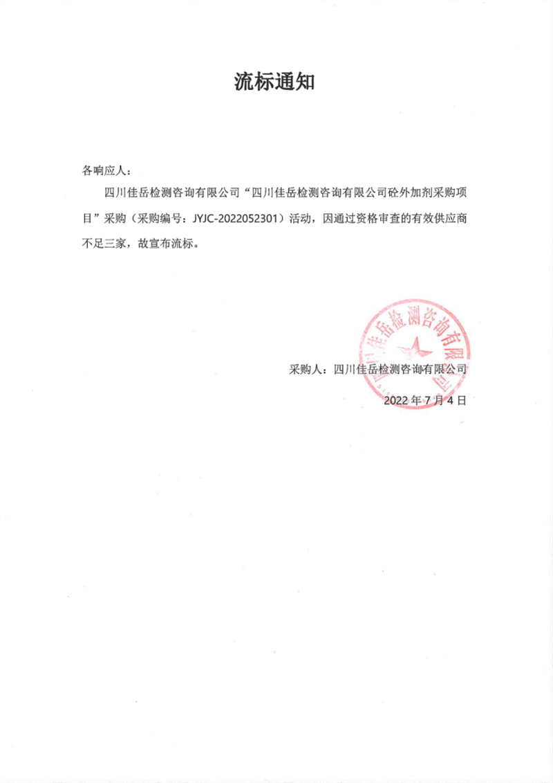 四川佳岳檢測咨詢有限公司砼外加劑采購項目流標通知