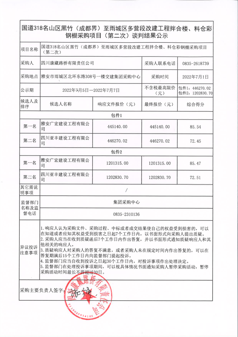 四川康藏路橋有限責(zé)任公司國道318名山區(qū)黑竹(成都界)至雨城區(qū)多營段改建工程拌合樓、料倉彩鋼棚采購項(xiàng)目(第二次)談判結(jié)果公示