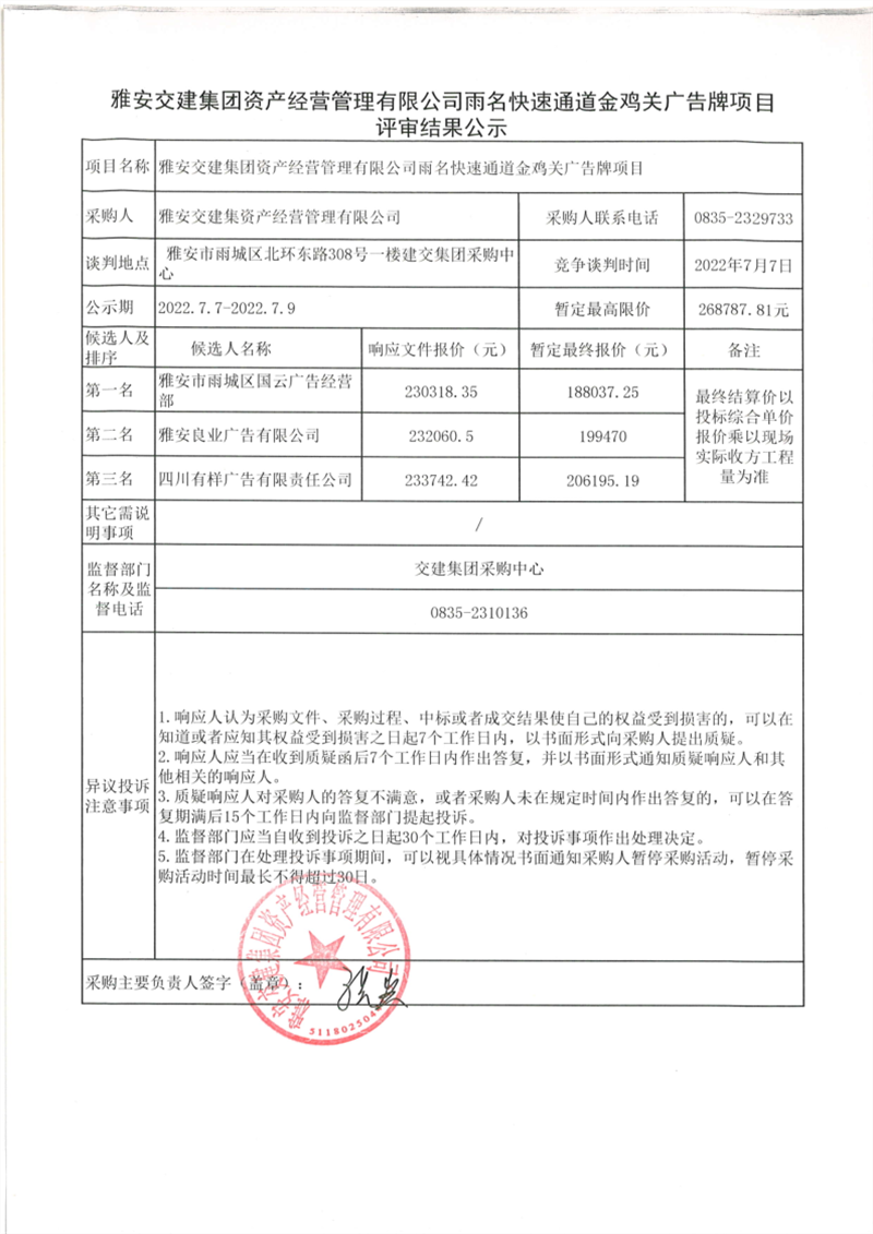 雅安交建集團資產(chǎn)經(jīng)營管理有限公司雨名快速通道金雞關(guān)廣告牌項目評審結(jié)果公示