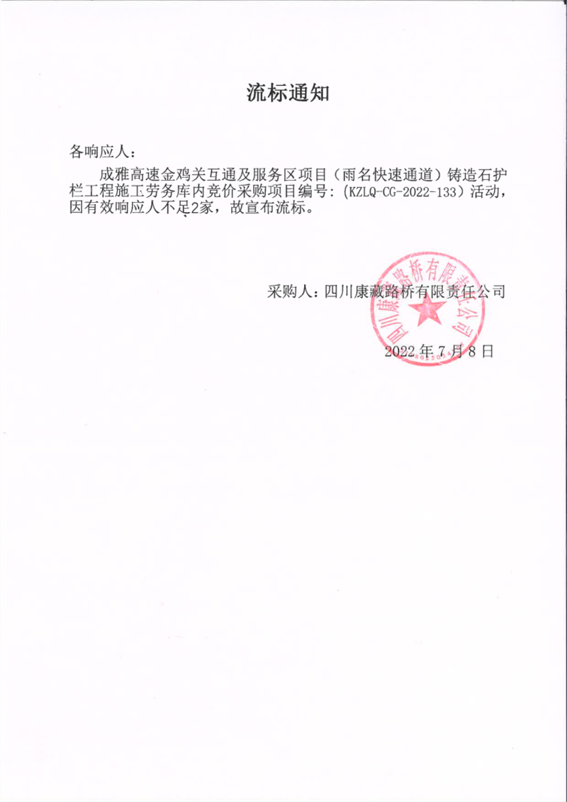 四川康藏路橋有限責任公司成雅高速金雞關(guān)互通及服務(wù)區(qū)項目(雨名快速通道)鑄造石護欄施工勞務(wù)庫內(nèi)競價采購項目流標通知