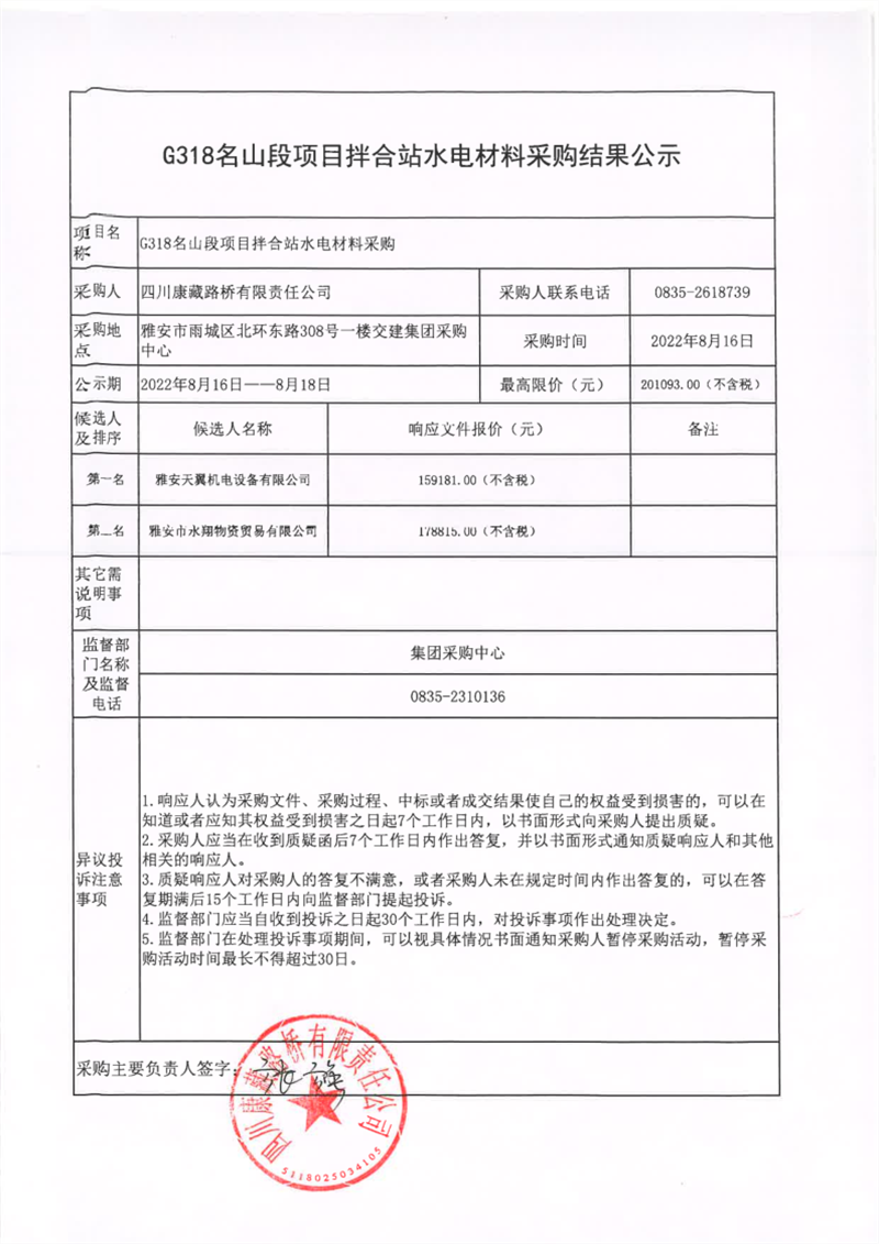 四川康藏路橋有限責(zé)任公司G318名山段項(xiàng)目拌合站水電材料采購結(jié)果公示