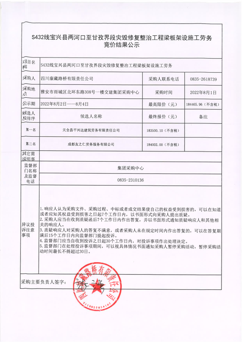 四川康藏路橋有限責(zé)任公司S432線寶興縣兩河口至甘孜界段災(zāi)毀修復(fù)整治工程梁板架設(shè)施工勞務(wù)競價(jià)結(jié)果公示