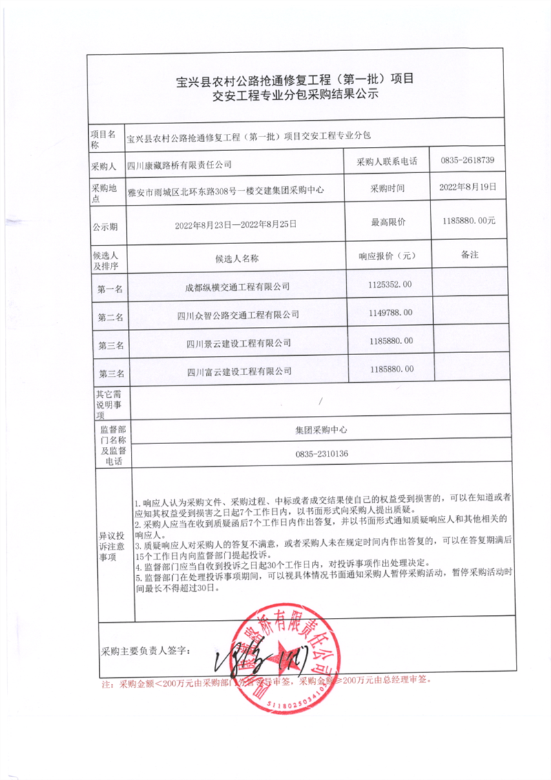 四川康藏路橋有限責任公司寶興縣農(nóng)村公路搶通修復工程(第一批)交安工程專業(yè)分包采購結果公示