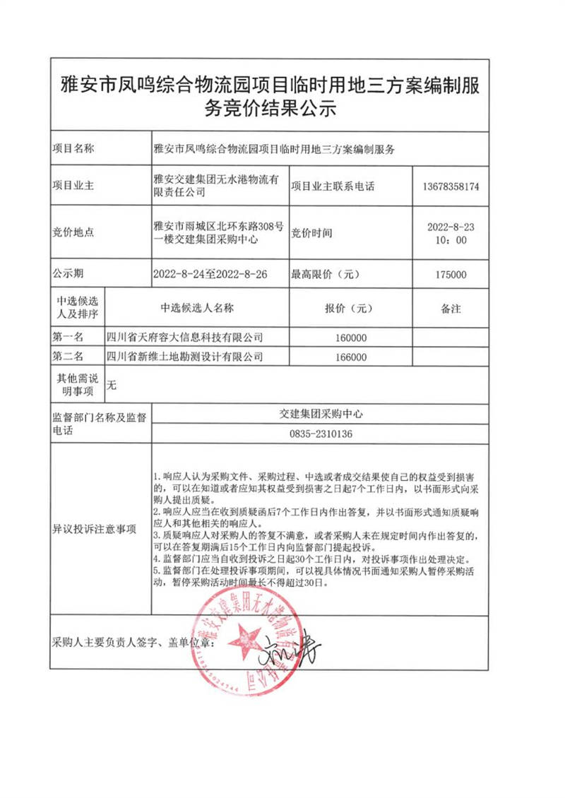 雅安交建集團(tuán)無水港物流有限責(zé)任公司雅安市鳳鳴綜合物流園項(xiàng)目臨時用地三方案編制服務(wù)競價(jià)結(jié)果公示