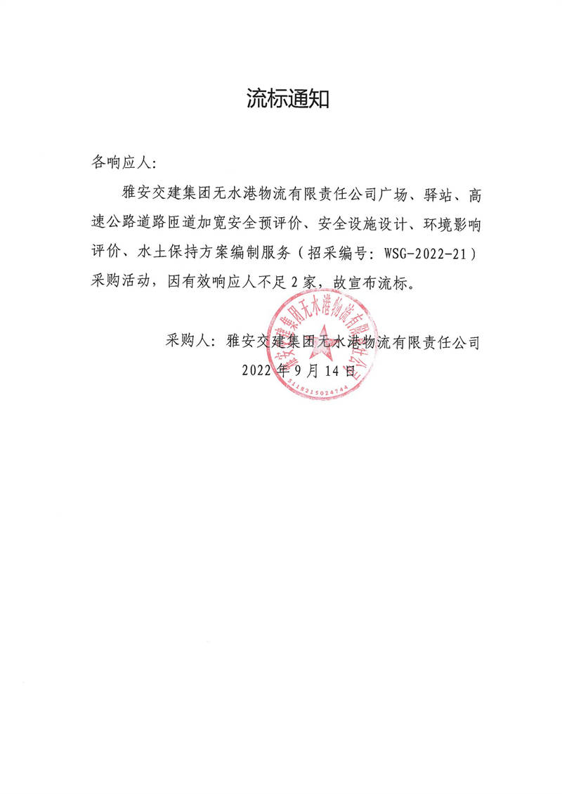 雅安交建集團無水港物流有限責(zé)任公司廣場、驛站、高速公路道路匝道加寬安全預(yù)評價、安全設(shè)施設(shè)計、環(huán)境影響評價、水土保持方案編制服務(wù)采購流標(biāo)通知