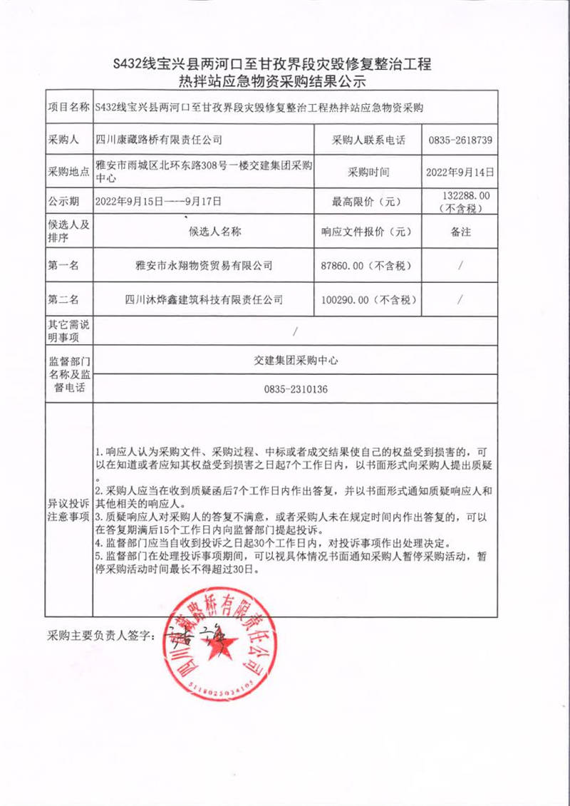 四川康藏路橋有限責(zé)任公司S432線寶興縣兩河口至甘孜界段災(zāi)毀修復(fù)整治工程熱拌站應(yīng)急物資采購(gòu)結(jié)果公示