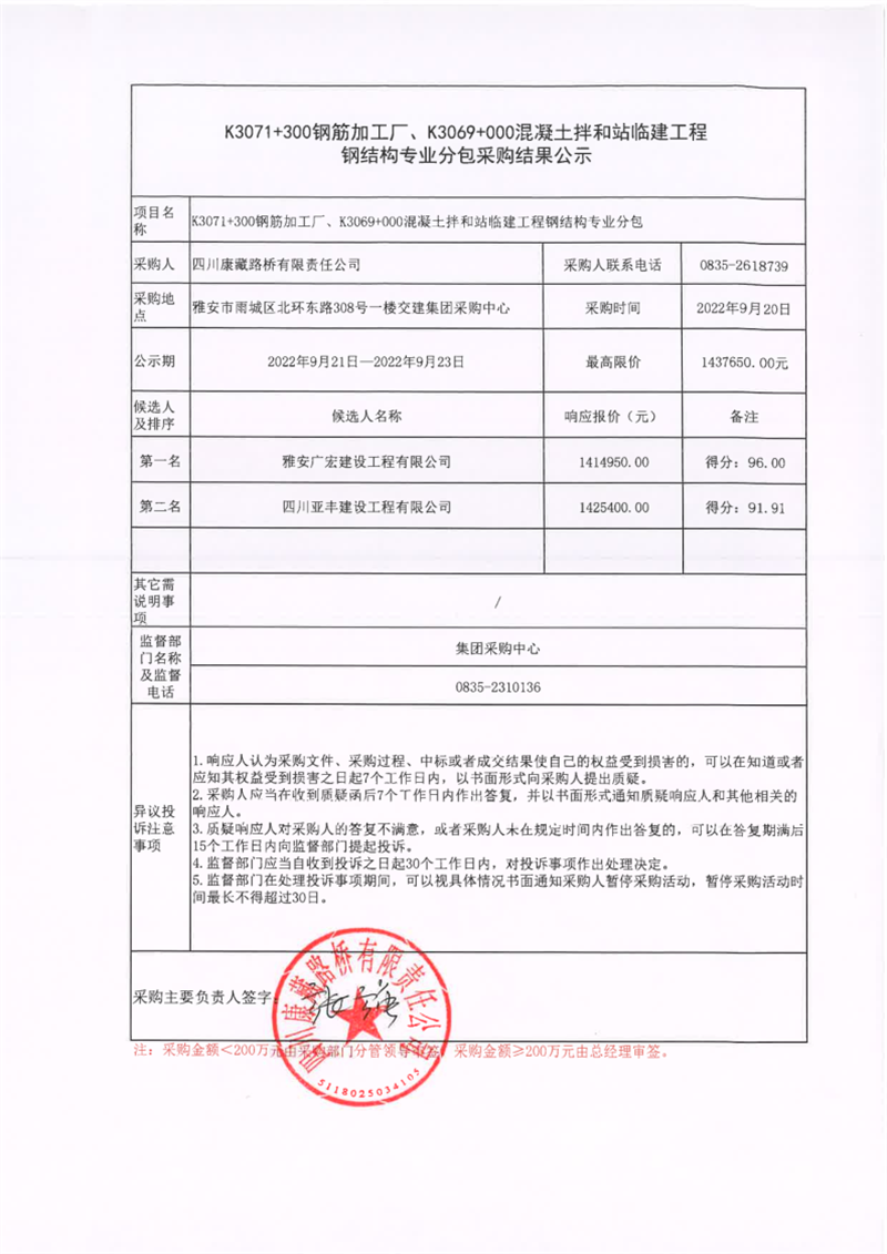 四川康藏路橋有限責(zé)任公司K3071+300鋼筋加工廠、K3069+000混凝土拌和站臨建工程鋼結(jié)構(gòu)專業(yè)分包采購結(jié)果公示