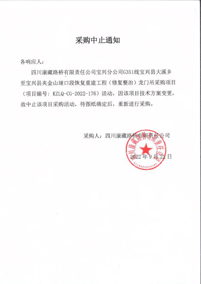 四川康藏路橋有限責(zé)任公司寶興分公司G351線寶興縣大溪鄉(xiāng)至寶興縣夾金山埡口段恢復(fù)重建工程(修復(fù)整治)龍門(mén)吊采購(gòu)中止通知