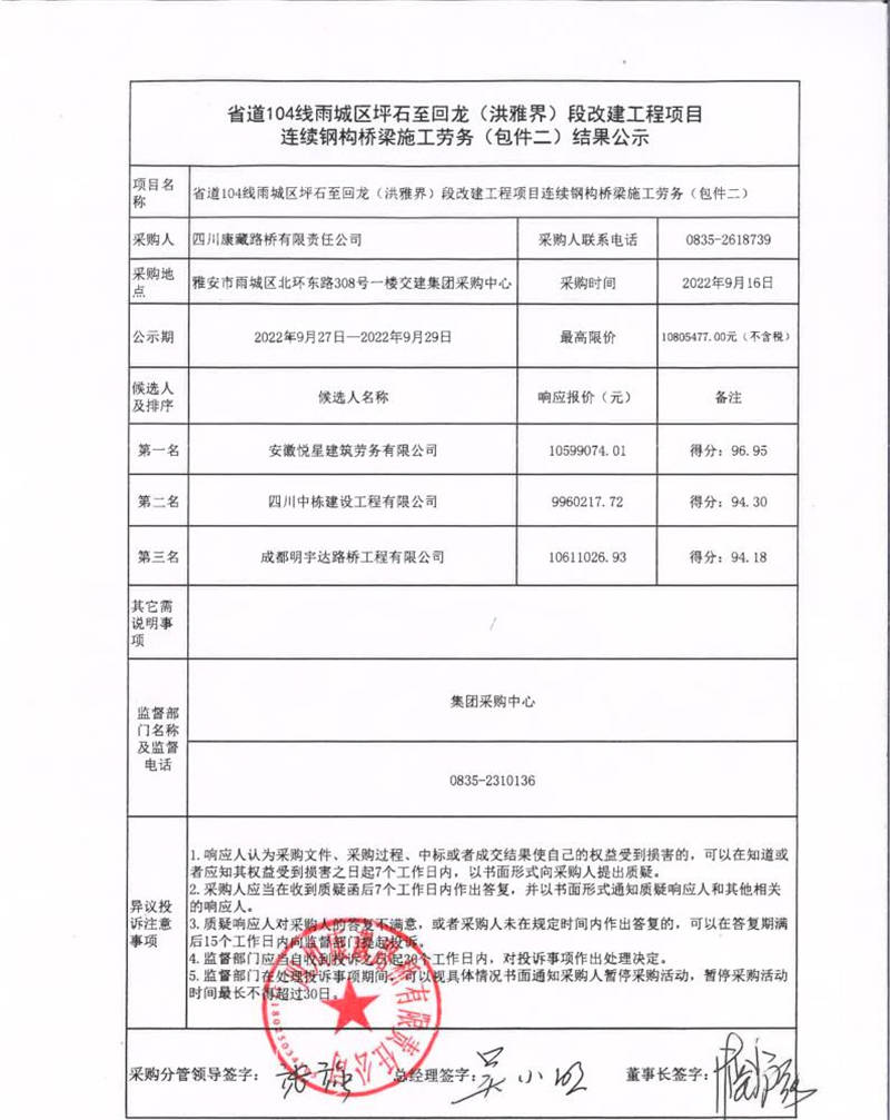 四川康藏路橋有限責任公司省道104線雨城區(qū)坪石至回龍(洪雅界)段改建工程項目連續(xù)鋼構(gòu)橋梁施工勞務(包件二)結(jié)果公示