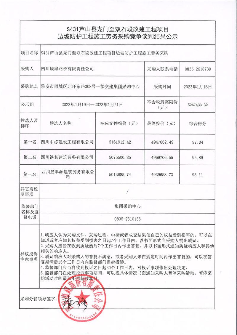 四川康藏路橋有限責任公司S431蘆山縣龍門至雙石段改建工程項目邊坡防護工程施工勞務(wù)采購競爭談判結(jié)果公示