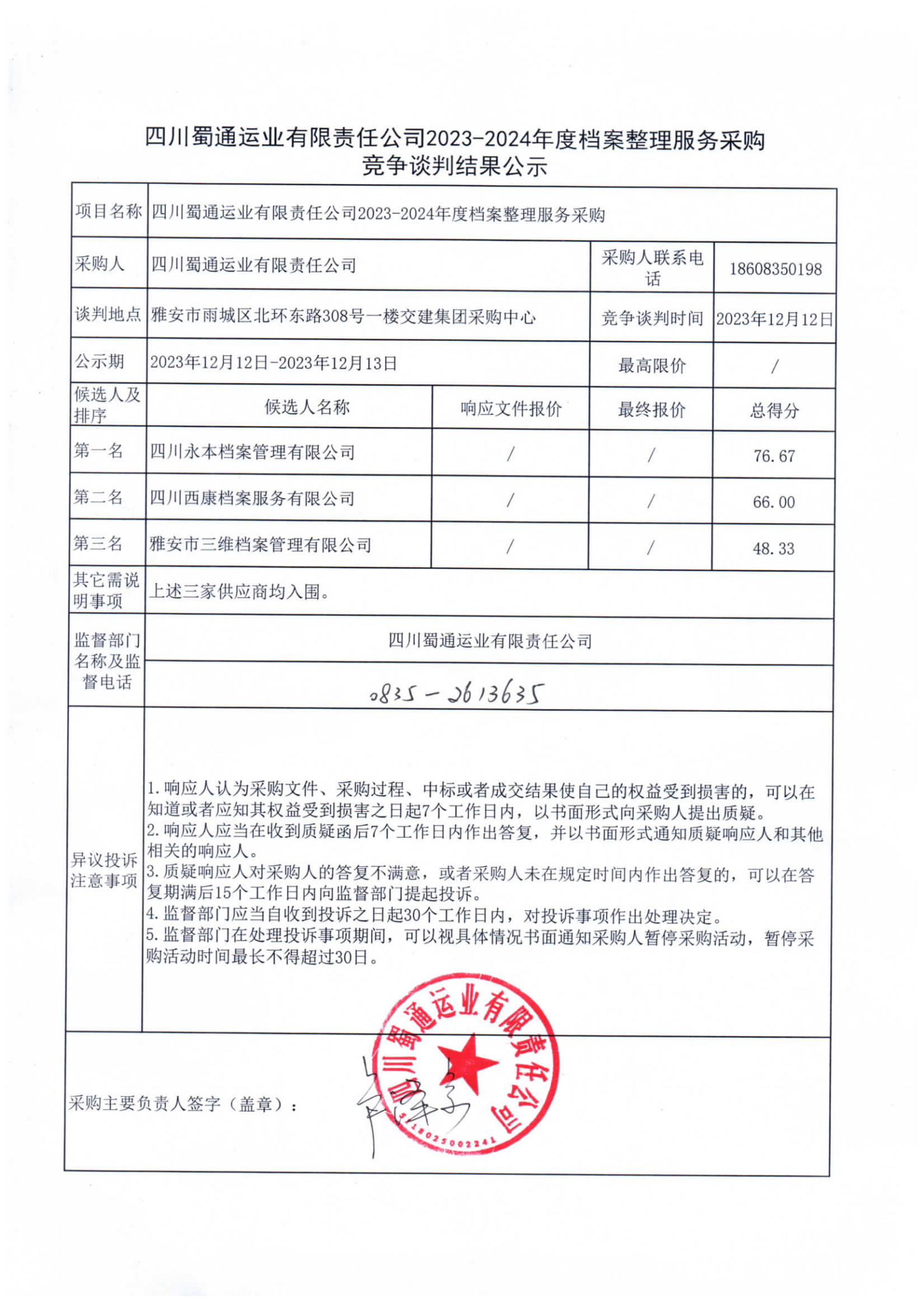 四川蜀通運業(yè)有限責任公司2023-2024年度檔案整理服務(wù)采購競爭談判結(jié)果公示