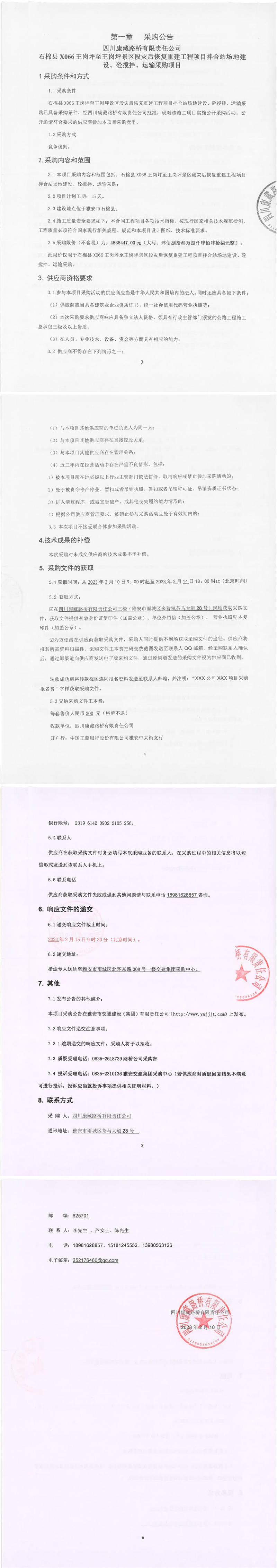 四川康藏路橋有限責(zé)任公司石棉縣X066王崗坪至王崗坪景區(qū)段災(zāi)后恢復(fù)重建工程項目拌合站場地建設(shè)、砼攪拌、運輸采購項目采購公告