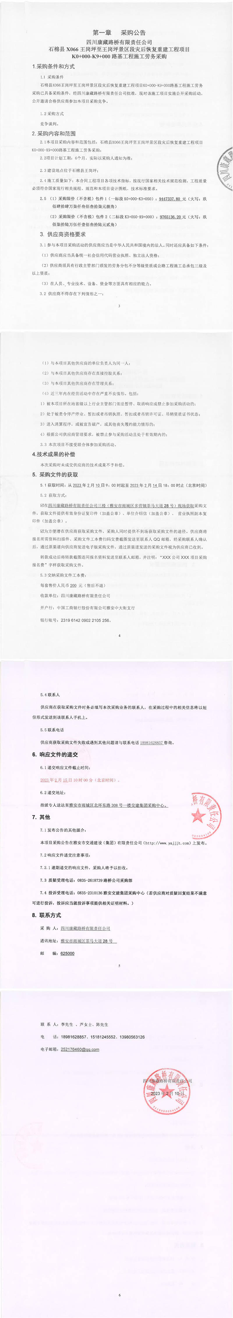四川康藏路橋有限責(zé)任公司石棉縣X066王崗坪至王崗坪景區(qū)段災(zāi)后恢復(fù)重建工程項(xiàng)目K0+000-K9+000路基工程施工勞務(wù)采購采購公告
