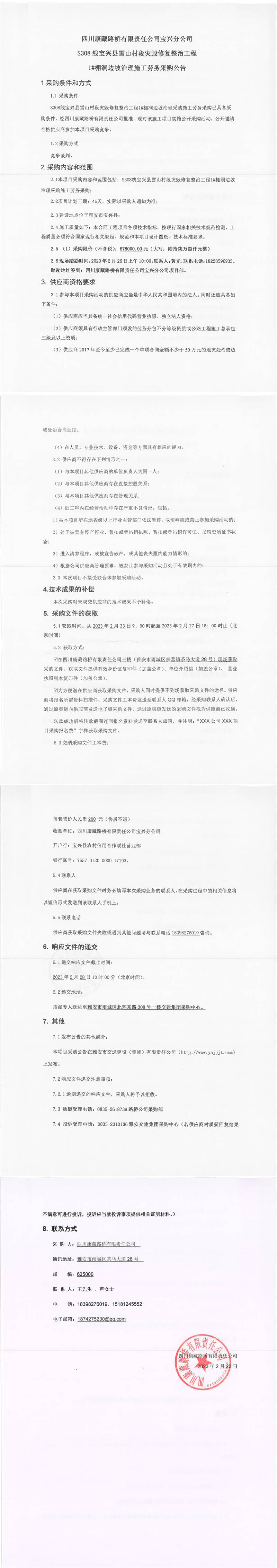 四川康藏路橋有限責任公司寶興分公司S308線寶興縣雪山村段災毀修復整治工程1#棚洞邊坡治理施工勞務采購公告