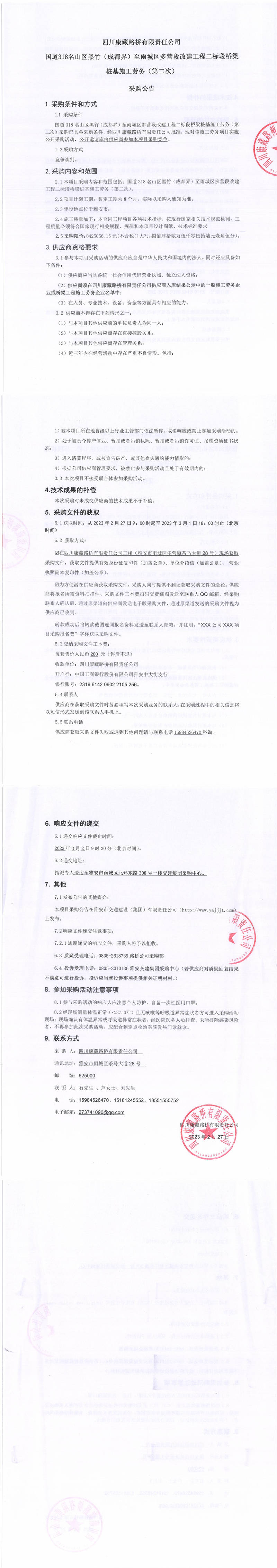四川康藏路橋有限責(zé)任公司國道318名山區(qū)黑竹(成都界)至雨城區(qū)多營段改建工程二標段橋梁樁基施工勞務(wù)(第二次)采購公告