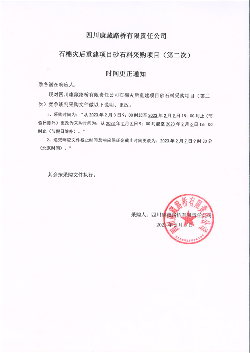 四川康藏路橋有限責(zé)任公司石棉災(zāi)后重建項(xiàng)目砂石料采購(gòu)項(xiàng)目(第二次)時(shí)間更正通知
