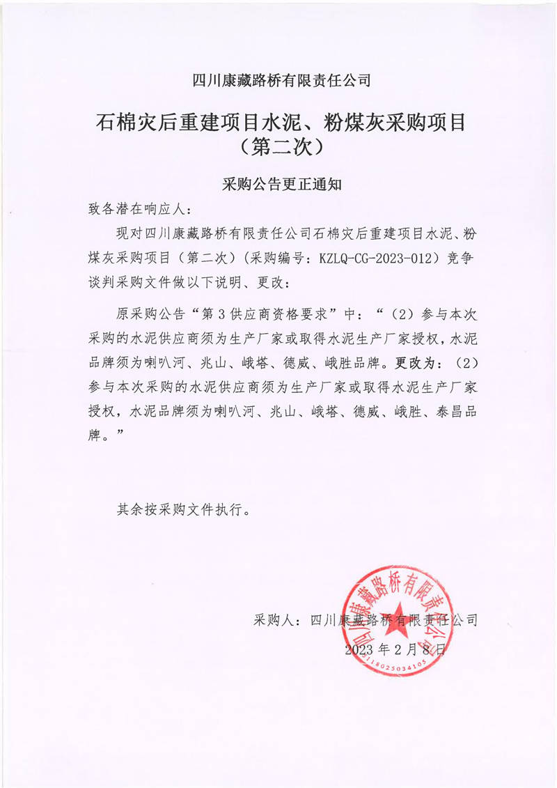 四川康藏路橋有限責(zé)任公司石棉災(zāi)后重建項(xiàng)目水泥、粉煤灰采購項(xiàng)目(第二次)采購公告更正通知
